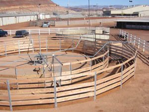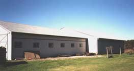 | Model US2460 installed at D. Johnson Stables (OH). This 4 horse model was customized to 58' to fit inside this existing covered arena. HARNESS RACING STABLE | |
