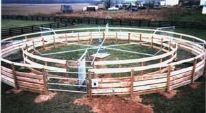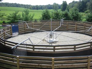 Model US2450 installed at BLOOMING HILLS farm (CA) with classic I fences, pre-programmed controller and solar fencer option. This 4 horse model and fences were customized to 46' diameter to fit under existing structure. TB RACING STABLE |
